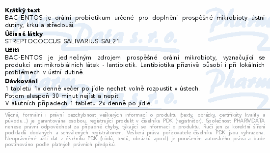 BAC-ENTOS Orální mikroflóra je doplněk stravy s obsahem orální probiotické kultury Streptococcus salivarius, která je přirozenou součástí mikroflóry dutiny ústní. Kdy a jak užívat přípravek BAC-ENTOS? Přípravek BAC-ENTOS se užívá 2x denně (ráno a večer) po dobu 10 dnů. Tablety se nepolykají, ale nechají se volně rozpustit v ústech. Po užití orálních probiotik BAC-ENTOS je potřeba alespoň hodinu nekonzumovat jídlo ani nápoje, vyhnout se čištění zubů a nepoužívat přípravky na desinfekci ústní dutiny. Přípravek BAC-ENTOS můžete užívat i dlouhodobě. V tomto případě BAC-ENTOS užíváme 1x denně (večer) po dobu 1–2 měsíců.