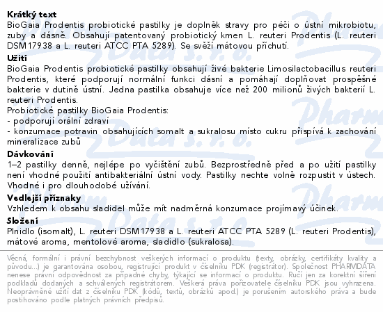 BioGaia Prodentis probiotické pastilky je doplněk stravy pro péči o ústní mikrobiotu, zuby a dásně. Obsahují patentovaný probiotický kmen L. reuteri Prodentis (L. reuteri DSM17938 a L. reuteri ATCC PTA 5289). Se svěží mátovou příchutí.