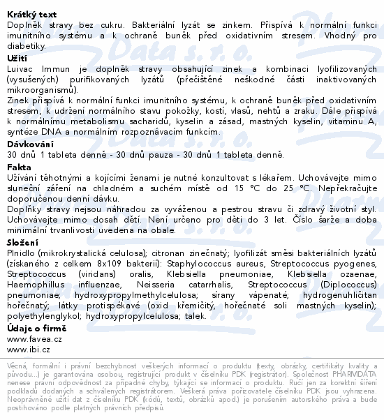 Doplněk stravy bez cukru. Bakteriální lyzát se zinkem. Přispívá k normální funkci imunitního systému a k ochraně buněk před oxidativním stresem. Vhodný pro diabetiky.