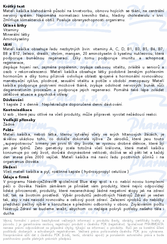 Mateří kašička blahodárně působí na krvetvorbu, obnovu hojících se tkání, na centrální nervový systém. Napomáhá normalizaci krevního tlaku, hladiny cholesterolu v krvi. Zmírňuje klimakterické obtíž. Posiluje obranyschopnosti organismu.