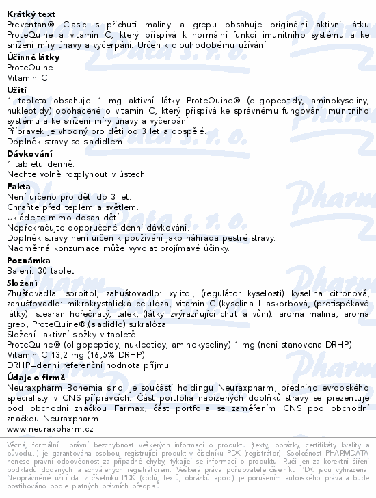 Preventan® Clasic s příchutí maliny a grepu obsahuje originální aktivní látku ProteQuine a vitamin C, který přispívá k normální funkci imunitního systému a ke snížení míry únavy a vyčerpání. Určen k dlouhodobému užívání.
