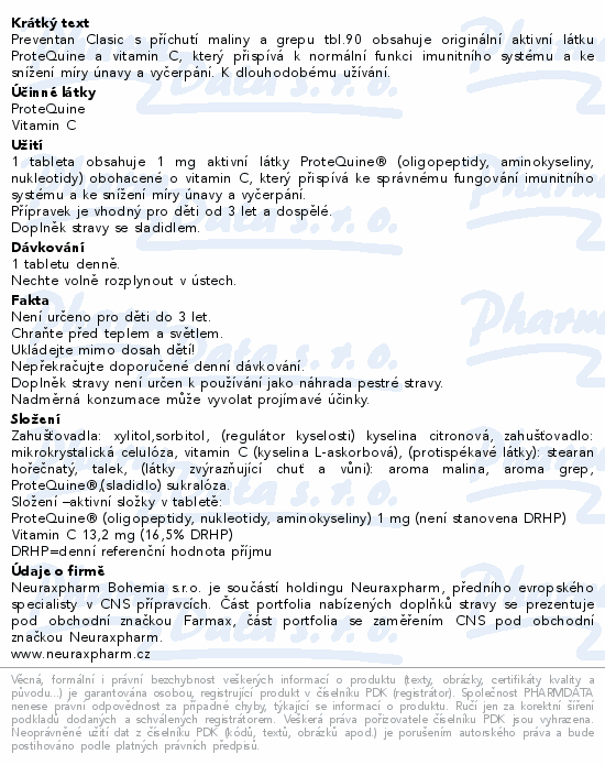 Preventan Clasic s příchutí maliny a grepu tbl.90 obsahuje originální aktivní látku ProteQuine a vitamin C, který přispívá k normální funkci imunitního systému a ke snížení míry únavy a vyčerpání. K dlouhodobému užívání.