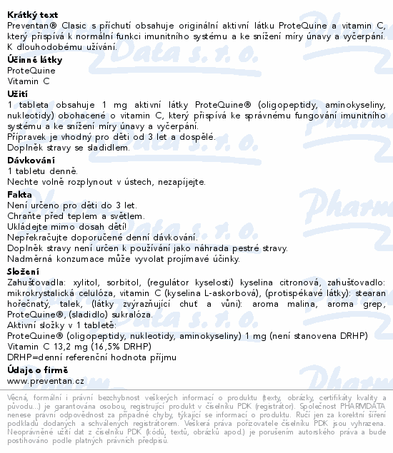 Preventan® Clasic s příchutí obsahuje originální aktivní látku ProteQuine a vitamin C, který přispívá k normální funkci imunitního systému a ke snížení míry únavy a vyčerpání. K dlouhodobému užívání.