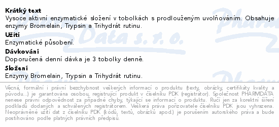 Vysoce aktivní enzymatické složení v tobolkách s prodlouženým uvolňováním. Obsahuje enzymy Bromelain, Trypsin a Trihydrát rutinu.