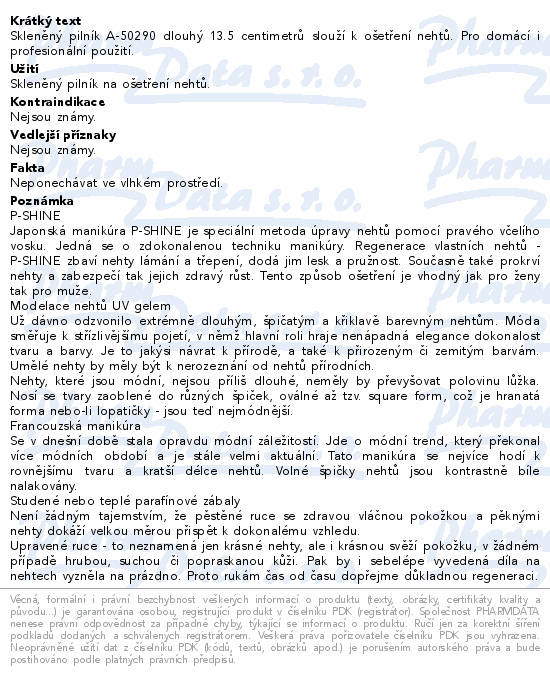 Skleněný pilník A-50290 dlouhý 13.5 centimetrů slouží k ošetření nehtů. Pro domácí i profesionální použití.
