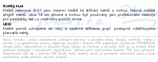 Kleště nerezové SI-01 jsou masivní kleště ke stříhání nehtů u nohou, hlavně zvláště silných nehtů. Jsou 14 cm dlouhé a mohou být používany jako profesionální nástroje pro pedikérky, tak i k osobnímu použití doma.