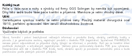 Péče o Vaše ruce a nohy s výrobky od firmy GGS Solingen by neměla být opomíjená. Díky této sadě bude Vaše péče kvalitní a příjemná. Manikúra je velmi vhodný dárek.