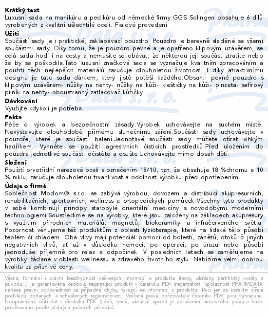Luxusní sada na manikúru a pedikúru od německé firmy GGS Solingen obsahuje 6 dílů vyrobených z kvalitní ušlechtilé oceli. Fialové provedení.