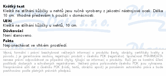 Kleště na stříhání kůžičky u nehtů jsou ručně vyrobeny z jakostní nástrojové oceli. Délka 10 cm. Vhodné především k použití v domácnosti.