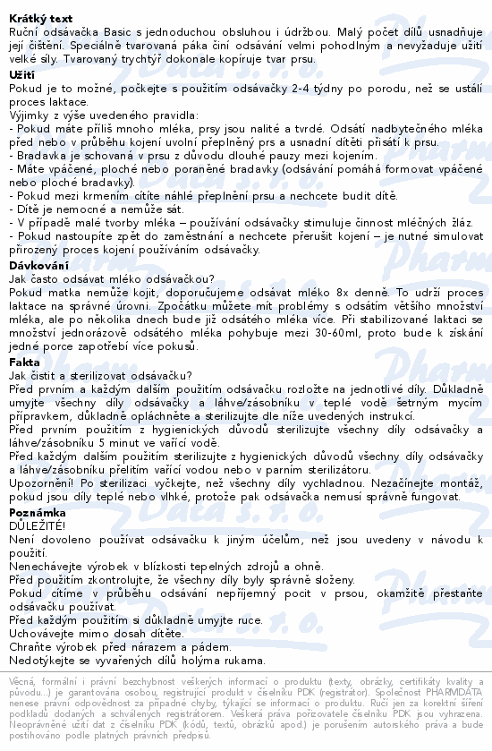 Ruční odsávačka Basic s jednoduchou obsluhou i údržbou. Malý počet dílů usnadňuje její čištění. Speciálně tvarovaná páka činí odsávání velmi pohodlným a nevyžaduje užití velké síly. Tvarovaný trychtýř dokonale kopíruje tvar prsu.