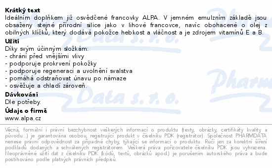 Ideálním doplňkem již osvědčené francovky ALPA. V jemném emulzním základě jsou obsaženy stejné přírodní silice jako v lihové francovce, navíc obohacené o olej z obilných klíčků, který dodává pokožce hebkost a vláčnost a je zdrojem vitamínů E a B.