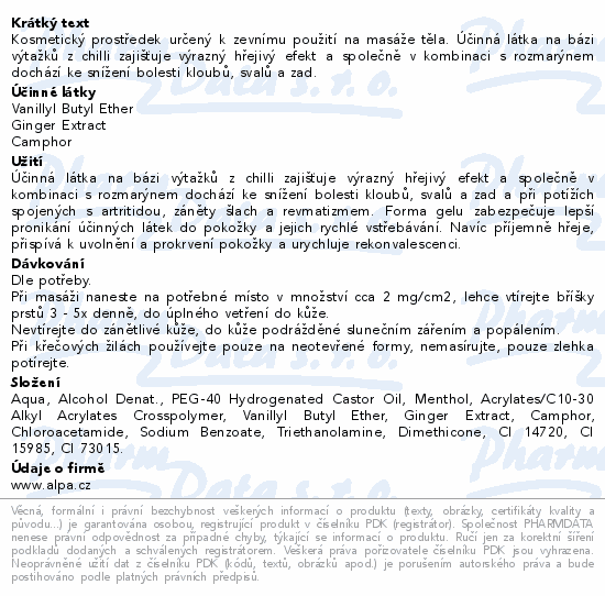 Kosmetický prostředek určený k zevnímu použití na masáže těla. Účinná látka na bázi výtažků z chilli zajišťuje výrazný hřejivý efekt a společně v kombinaci s rozmarýnem dochází ke snížení bolesti kloubů, svalů a zad.
