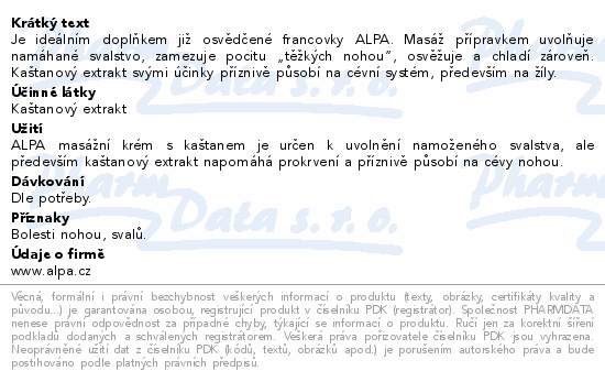 Je ideálním doplňkem již osvědčené francovky ALPA. Masáž přípravkem uvolňuje namáhané svalstvo, zamezuje pocitu „těžkých nohou“, osvěžuje a chladí zároveň. Kaštanový extrakt svými účinky příznivě působí na cévní systém, především na žíly.