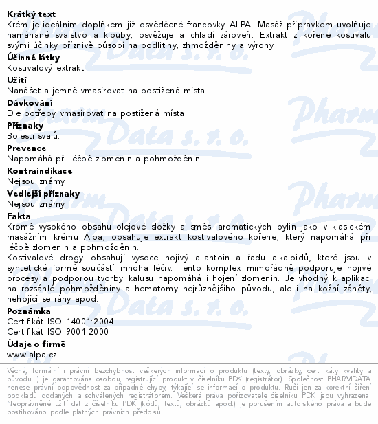 Krém je ideálním doplňkem již osvědčené francovky ALPA. Masáž přípravkem uvolňuje namáhané svalstvo a klouby, osvěžuje a chladí zároveň. Extrakt z kořene kostivalu svými účinky příznivě působí na podlitiny, zhmožděniny a výrony.