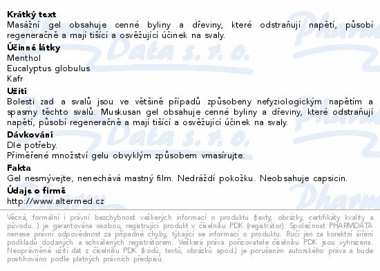 Masážní gel obsahuje cenné byliny a dřeviny, které odstraňují napětí, působí regeneračně a mají tišící a osvěžující účinek na svaly.