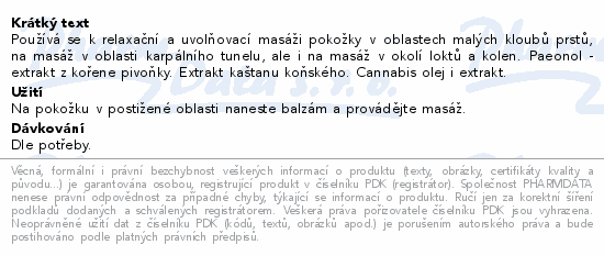 Používá se k relaxační a uvolňovací masáži pokožky v oblastech malých kloubů prstů, na masáž v oblasti karpálního tunelu, ale i na masáž v okolí loktů a kolen. Paeonol - extrakt z kořene pivoňky. Extrakt kaštanu koňského. Cannabis olej i extrakt.