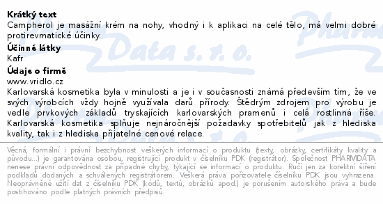 Campherol je masážní krém na nohy, vhodný i k aplikaci na celé tělo, má velmi dobré protirevmatické účinky.