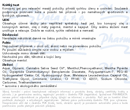 Konopný gel pro relaxační masáž pokožky přináší rychlou úlevu a uvolnění. Současně podporuje prokrvení kůže a působí tak příznivě i po namáhavých sportovních a fyzických výkonech.