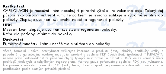 CARLOLACIN je masážní krém obsahující přírodní výtažek ze zeleného čaje. Zelený čaj působí jako přírodní antiseptikum. Tento krém se snadno aplikuje a výborně se vtírá do pokožky. Zlepšuje uvolnění svalového napětí a regeneraci pokožky.