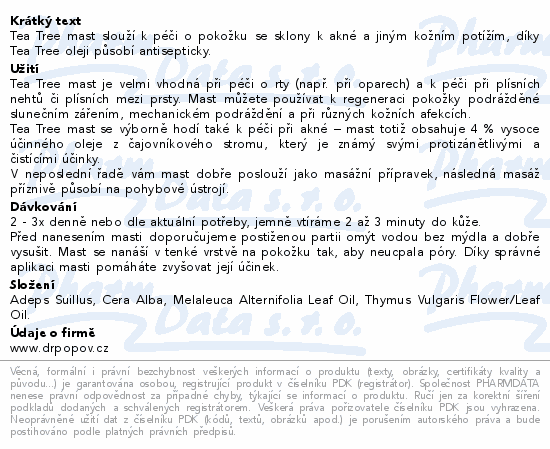 Tea Tree mast slouží k péči o pokožku se sklony k akné a jiným kožním potížím, díky Tea Tree oleji působí antisepticky.