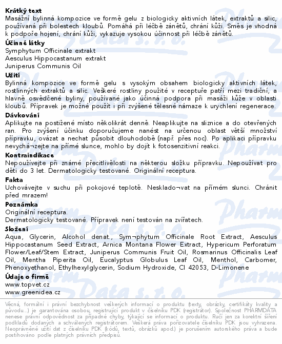 Masážní bylinná kompozice ve formě gelu z biologicky aktivních látek, extraktů a silic, používaná při bolestech kloubů. Pomáhá při léčbě zánětů, chrání kůži. Směs je vhodná k podpoře hojení, chrání kůži, vykazuje vysokou účinnost při léčbě zánětů.