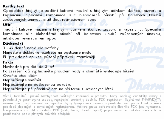 Opodeldok hřejivý je tradiční kafrové mazání s hřejivým účinkem skořice, zázvoru a kapsaicinu. Speciální kombinace silic blahodárně působí při bolestech kloubů způsobených únavou, artritidou, revmatismem apod.