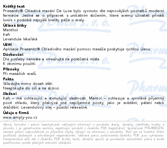 Priessnitz® Chladivé mazání De Luxe bylo vyvinuto dle nejnovějších poznatků moderní farmacie. Jedná se o přípravek s unikátním složením, které svému uživateli přináší luxus v podobě nejvyšší kvality péče o svaly.