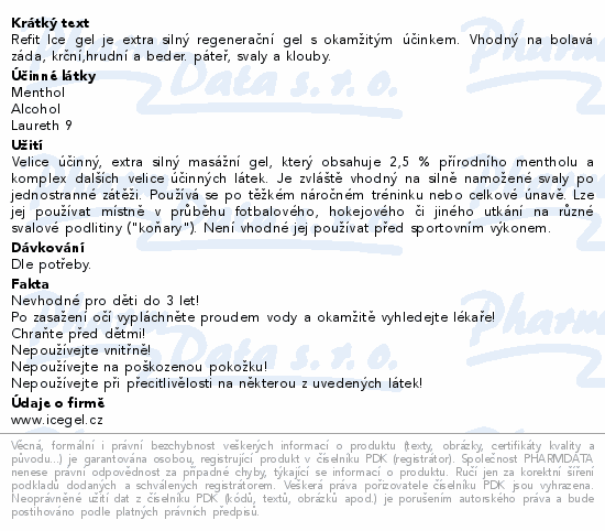 Refit Ice gel je extra silný regenerační gel s okamžitým účinkem. Vhodný na bolavá záda, krční,hrudní a beder. páteř, svaly a klouby.