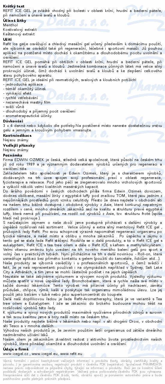 REFIT ICE GEL je zvláště vhodný při bolesti v oblasti krční, hrudní a bederní páteře, při namožení a únavě svalů a kloubů.