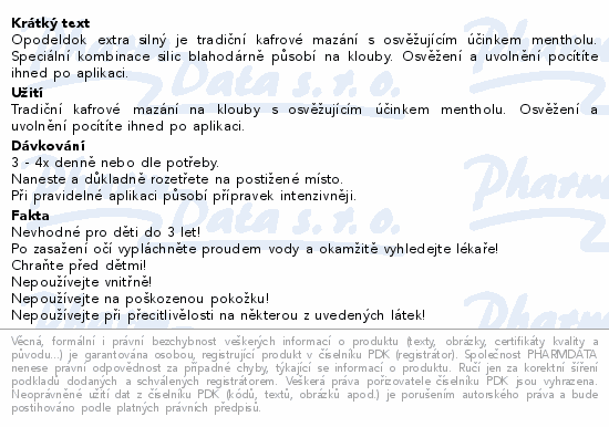 Opodeldok extra silný je tradiční kafrové mazání s osvěžujícím účinkem mentholu. Speciální kombinace silic blahodárně působí na klouby. Osvěžení a uvolnění pocítíte ihned po aplikaci.