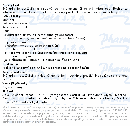 Sněhurka je osvěžující a chladivý gel na unavená či bolavá místa těla. Rychle se vstřebává, nezanechává na pokožce lepkavý pocit. Neobsahuje konzervační látky.
