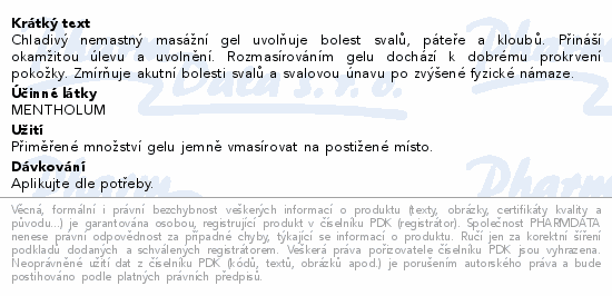 Chladivý nemastný masážní gel uvolňuje bolest svalů, páteře a kloubů. Přináší okamžitou úlevu a uvolnění. Rozmasírováním gelu dochází k dobrému prokrvení pokožky. Zmírňuje akutní bolesti svalů a svalovou únavu po zvýšené fyzické námaze.