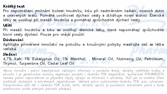 Pro napomáhání zmírnění bolesti hrudníku, krku při nadměrném kašlání, nosních dutin a unavených svalů. Pomáhá uvolňovat dýchací cesty a zklidňuje nosní sliznici. Éterické látky se uvolňují při masáži hrudníku a pomáhají zprůchodnit dýchací cesty.