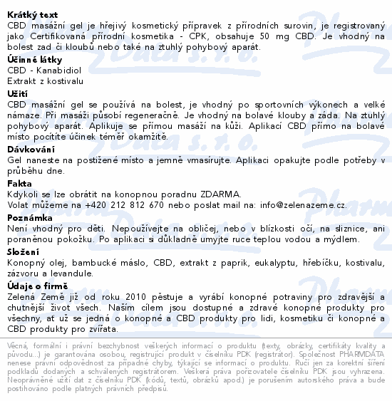 CBD masážní gel je hřejivý kosmetický přípravek z přírodních surovin, je registrovaný jako Certifikovaná přírodní kosmetika - CPK, obsahuje 50 mg CBD. Je vhodný na bolest zad či kloubů nebo také na ztuhlý pohybový aparát.
