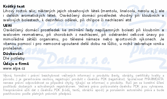 Lihový roztok silic, některých jejich obsahových látek (mentolu, linaloolu, nerolu aj.), ale i dalších aromatických látek. Osvědčený domácí prostředek vhodný při kloubních a svalových bolestech, k dezinfekci oděrek, při chřipce či nachlazení atd.