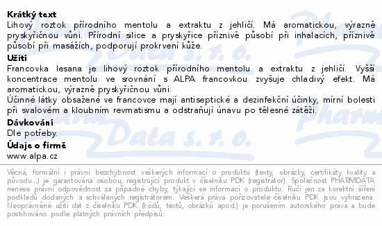 Lihový roztok přírodního mentolu a extraktu z jehličí. Má aromatickou, výrazně pryskyřičnou vůni. Přírodní silice a pryskyřice příznivě působí při inhalacích, příznivě působí při masážích, podporují prokrvení kůže.