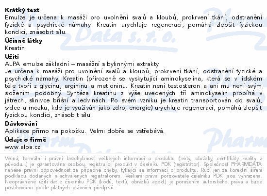 Emulze je určena k masáži pro uvolnění svalů a kloubů, prokrvení tkání, odstranění fyzické a psychické námahy. Kreatin urychluje regeneraci, pomáhá zlepšit fyzickou kondici, znásobit sílu.