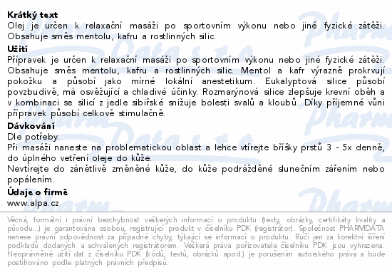 Olej je určen k relaxační masáži po sportovním výkonu nebo jiné fyzické zátěži. Obsahuje směs mentolu, kafru a rostlinných silic.
