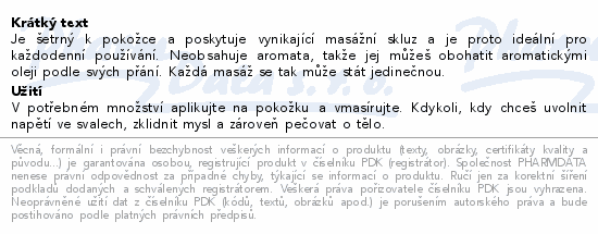 Je šetrný k pokožce a poskytuje vynikající masážní skluz a je proto ideální pro každodenní používání. Neobsahuje aromata, takže jej můžeš obohatit aromatickými oleji podle svých přání. Každá masáž se tak může stát jedinečnou.