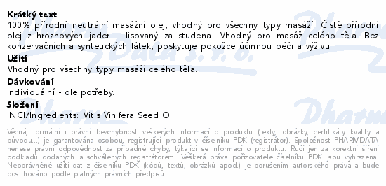 100% přírodní neutrální masážní olej, vhodný pro všechny typy masáží. Čistě přírodní olej z hroznových jader – lisovaný za studena. Vhodný pro masáž celého těla. Bez konzervačních a syntetických látek, poskytuje pokožce účinnou péči a výživu.