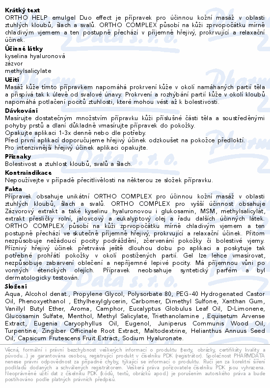 ORTHO HELP emulgel Duo effect je přípravek pro účinnou kožní masáž v oblasti ztuhlých kloubů, šlach a svalů. ORTHO COMPLEX působí na kůži zprvopočátku mírně chladivým vjemem a ten postupně přechází v příjemně hřejivý, prokrvující a relaxační účinek.