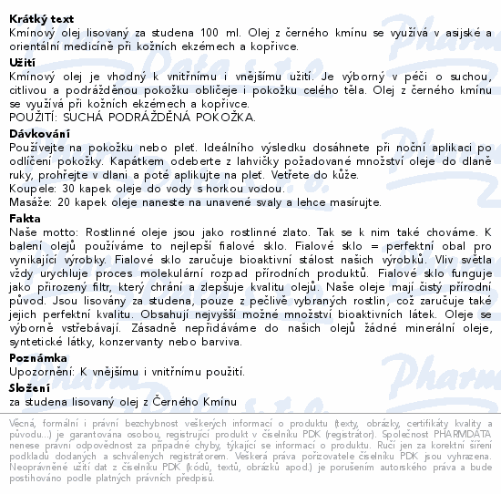Kmínový olej lisovaný za studena 100 ml. Olej z černého kmínu se využívá v asijské a orientální medicíně při kožních ekzémech a kopřivce.