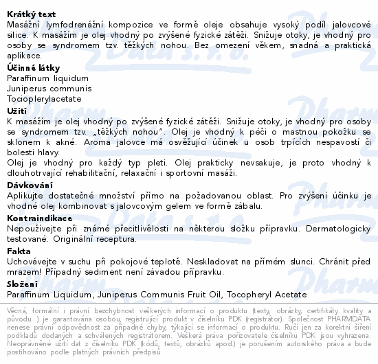 Masážní lymfodrenážní kompozice ve formě oleje obsahuje vysoký podíl jalovcové silice. K masážím je olej vhodný po zvýšené fyzické zátěži. Snižuje otoky, je vhodný pro osoby se syndromem tzv. těžkých nohou. Bez omezení věkem, snadná a praktická aplikace.