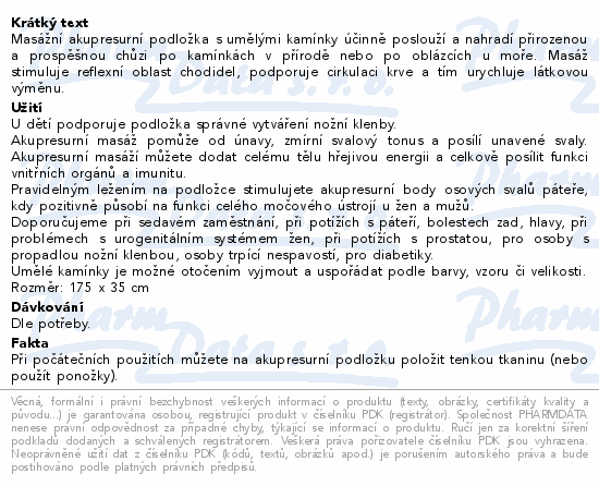 Masážní akupresurní podložka s umělými kamínky účinně poslouží a nahradí přirozenou a prospěšnou chůzi po kamínkách v přírodě nebo po oblázcích u moře. Masáž stimuluje reflexní oblast chodidel, podporuje cirkulaci krve a tím urychluje látkovou výměnu.