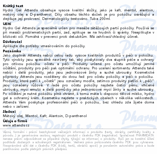 Hydro Gel Attends obsahuje vysoce kvalitní složky, jako je kafr, mentol, alantoin, mátový olej a D-panthenol. Díky obsahu těchto složek je pro pokožku osvěžující a zlepšuje její prokrvení. Dermatologicky testováno. Tuba 200ml.