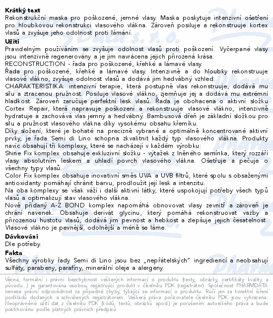 Rekonstrukční maska pro poškozené, jemné vlasy. Maska poskytuje intenzivní ošetření pro hloubkovou rekonstrukci vlasového vlákna. Zároveň posiluje a rekonstruuje kortex vlasů a zvyšuje jeho odolnost proti lámání.