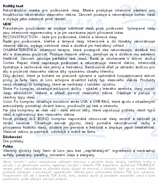 Rekonstrukční maska pro poškozené vlasy. Maska poskytuje intenzivní ošetření pro hloubkovou rekonstrukci vlasového vlákna. Zároveň posiluje a rekonstruuje kortex vlasů a zvyšuje jeho odolnost proti lámání.