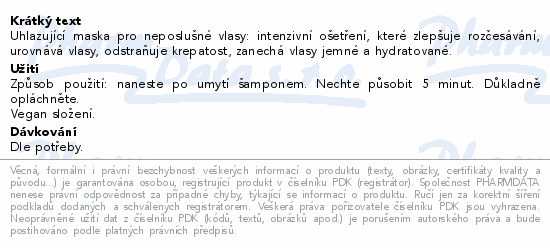 Uhlazující maska pro neposlušné vlasy: intenzivní ošetření, které zlepšuje rozčesávání, urovnává vlasy, odstraňuje krepatost, zanechá vlasy jemné a hydratované.