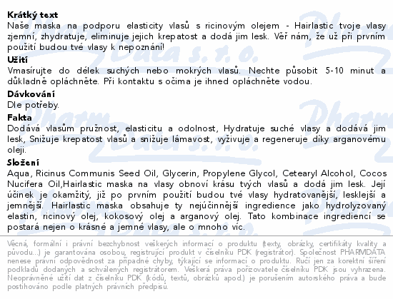 Naše maska na podporu elasticity vlasů s ricinovým olejem - Hairlastic tvoje vlasy zjemní, zhydratuje, eliminuje jejich krepatost a dodá jim lesk. Věř nám, že už při prvním použití budou tvé vlasy k nepoznání!