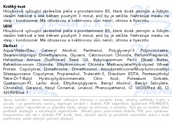 Hloubkově vyživující závěrečná péče s provitaminem B5, která dodá jemným a řídkým vlasům hebkost a lesk během pouhých 3 minut, aniž by je zatížila. Nahrazuje masku na vlasy i kondicionér. Má citrusovou a květinovou vůni neroli, citronu a hyacintu.
